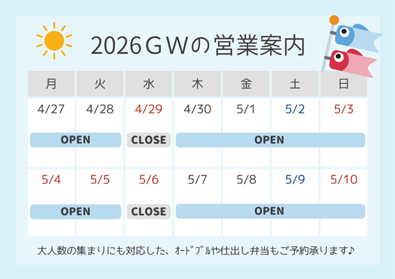誠に勝手ながら、5月21日(火)は臨時休業日とさせて頂きます。■ゴールデンウィークの営業案内 (2019/04/12)5/1(水)は通常通り休業とさせていただきます。■【重要】営業時間変更のお知らせ(2019/04/12)誠に勝手ながら、平成31年4月18日(木)より営業時間の変更させていただきます。新営業時間昼11:00~14:00夕16:00~19:30(電話受付時間9:00~19:30)